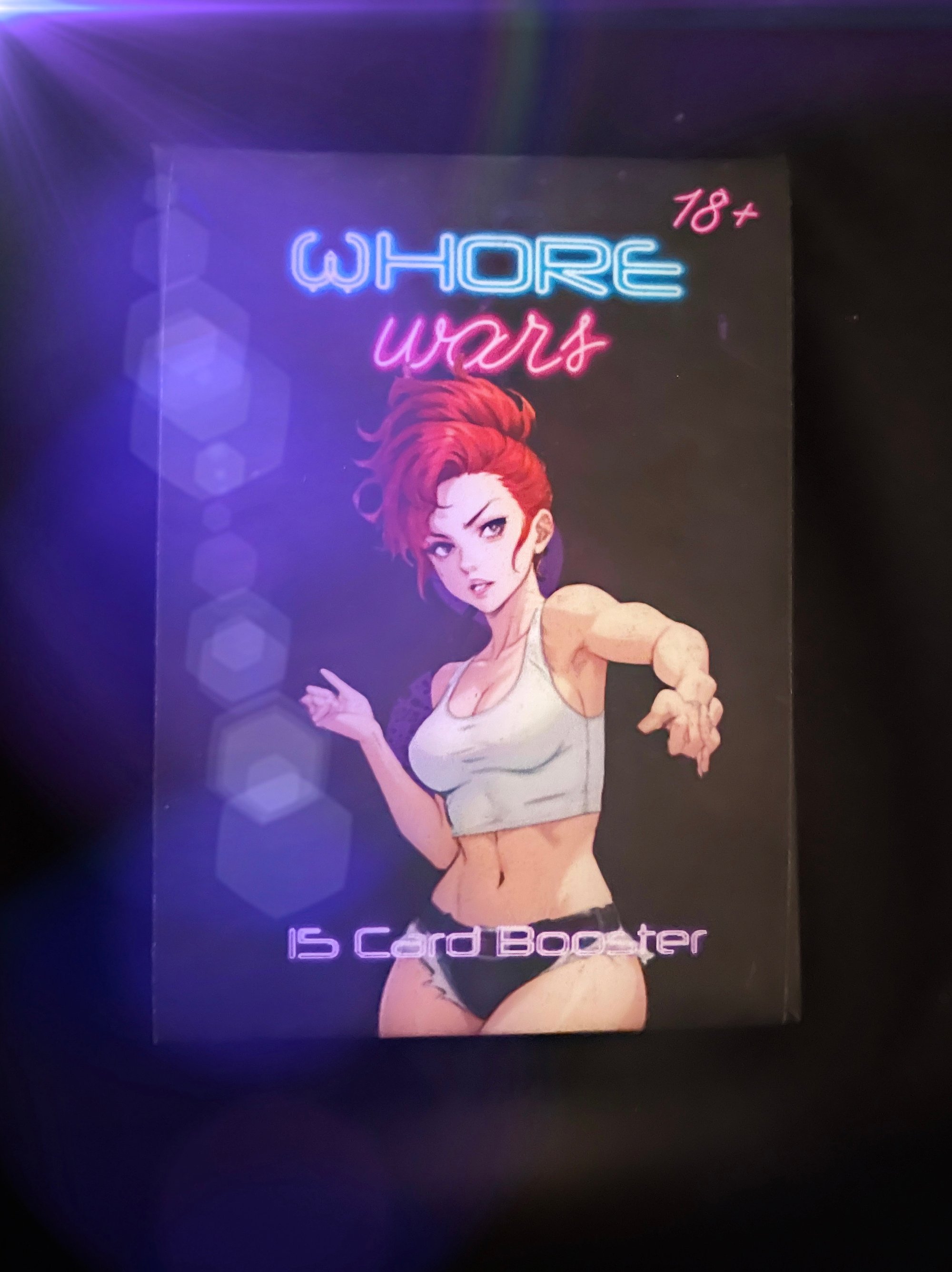 This is a pre-order! Product will ship at the end of November. 15 Card Booster pack for Whore Wars. Contains: 1 Full art card(any rarity) 1 Rare card 3 Uncommon cards 8 Common cards 1 Drug 1 Token